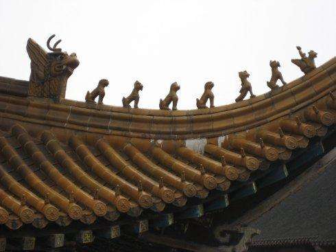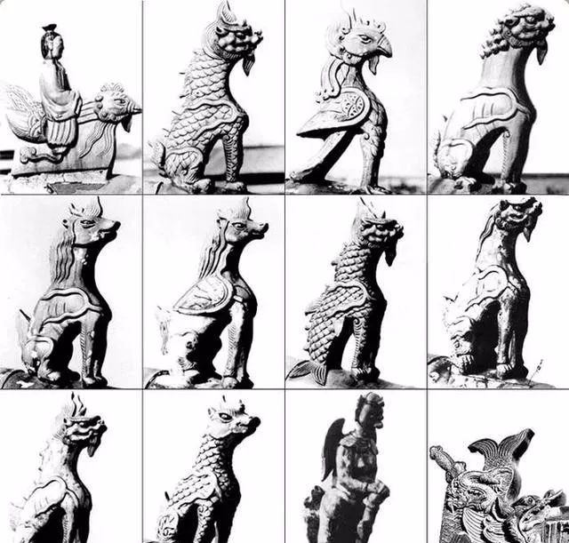 如果到過故宮的話,會(huì)看到屋宇的房脊、飛檐上大都有幾個(gè)極小的雕塑,或?yàn)槿诵危蜃鳙F狀。其實(shí)不止故宮,一些貴戚官宦的故居也有與之類似的裝飾,這些就是“五脊六獸”在建筑中的現(xiàn)實(shí)形態(tài)。中國(guó)古代傳統(tǒng)屋脊建筑樣式中,起脊的硬山式、懸山式和廡殿式建筑共有五條脊,分別為一條正脊和四條垂脊。正脊兩端有龍吻,又叫吞獸。四條垂脊排列著五個(gè)蹲獸,便統(tǒng)稱為“五脊六獸”。