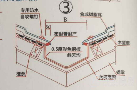4 宜將主瓦挑入天溝內50mm~120mm,并蓋住斜天溝水槽兩安裝定位邊。