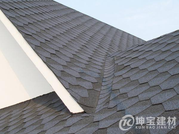 瀝青瓦是以玻璃纖維氈為胎體,經(jīng)浸涂優(yōu)質(zhì)石油瀝青后,瓦片一面覆蓋彩色礦無粒料物質(zhì),另外一面撒以隔離材料所制成的瓦狀屋面防水片材,它具有良好的防水、裝飾功能和色彩豐富,形式多樣,質(zhì)輕面細,施工簡便等特點。缺點是容易老化。