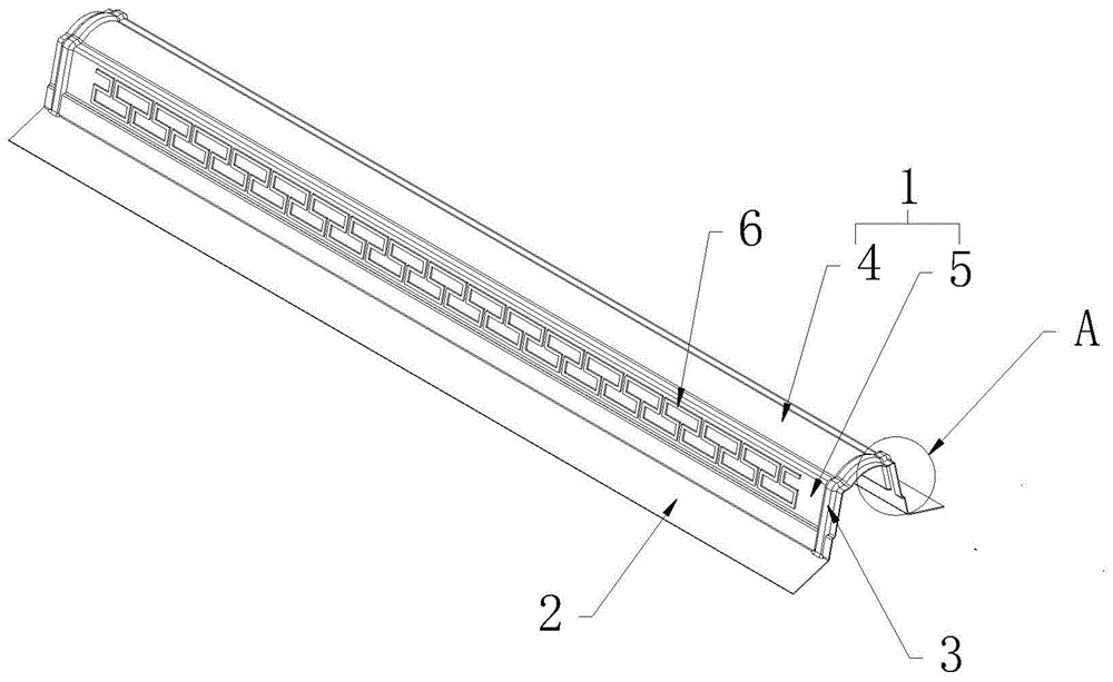 相比現有的合成樹脂斜脊瓦,本實用新型設置凸棱3進行限位搭接,可減少安裝成本、提高安裝效率;另外,脊瓦部1分成位于中部的拱形部4和連接在拱形部4兩側的裝飾部5,可保證本實用新型具有足夠的支撐強度和一定的彈性形變能力,并能根據安裝環境調整而匹配具體斜梁結構、傾斜度進行安裝;此外,裝飾部5設置仿古紋路6能糅合古典文化和現代材料工藝,提高產品競爭力。