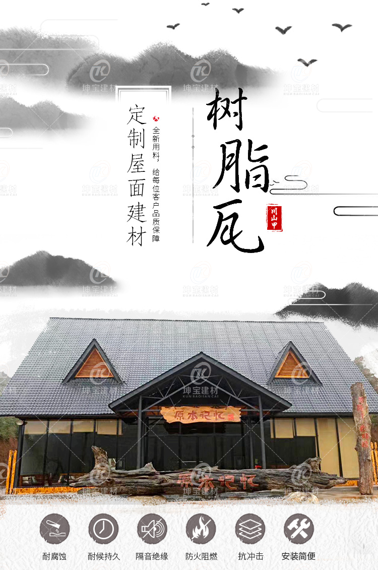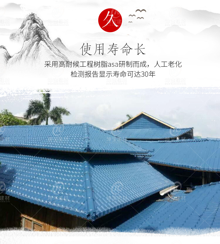 坤寶合成樹脂瓦采用高耐候ASA樹脂、韌性骨架層和高強度PVC耐磨層三層共技壓制而成,特點是色彩豐富并經久不褪,造型美觀立體感強且符合中國建筑文化特色。同時它還具有質輕、防水、堅韌、保溫、隔音、防腐蝕、抗風防震、抗冰雹、抗污染、防火、絕緣、安裝簡便等優點,是各類建筑表面裝飾和防水的理想材料,尤其適用于我國目前大力推廣的平改坡、新農村建設、新城鎮化、別墅屋面、民用建筑等屋面。